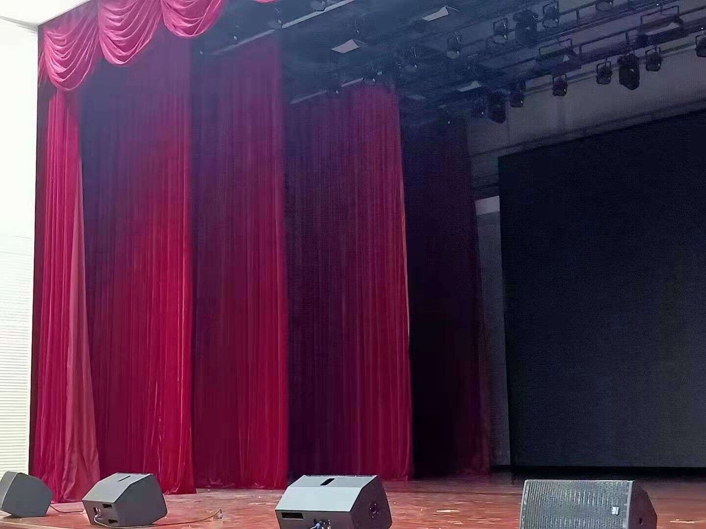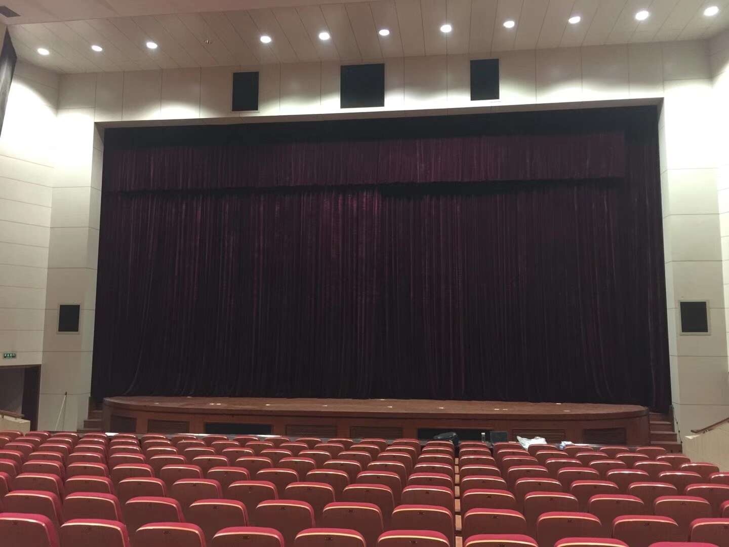 1. 防火幕:防火幕緊貼臺(tái)口;一般超過(guò)1200坐,要求必須設(shè)計(jì)防火幕;2. 前沿幕(徽標(biāo)):防火幕以后,間隔300mm左右;若沒(méi)有防火幕緊靠臺(tái)口200-300mm;3. 對(duì)開(kāi)大幕: